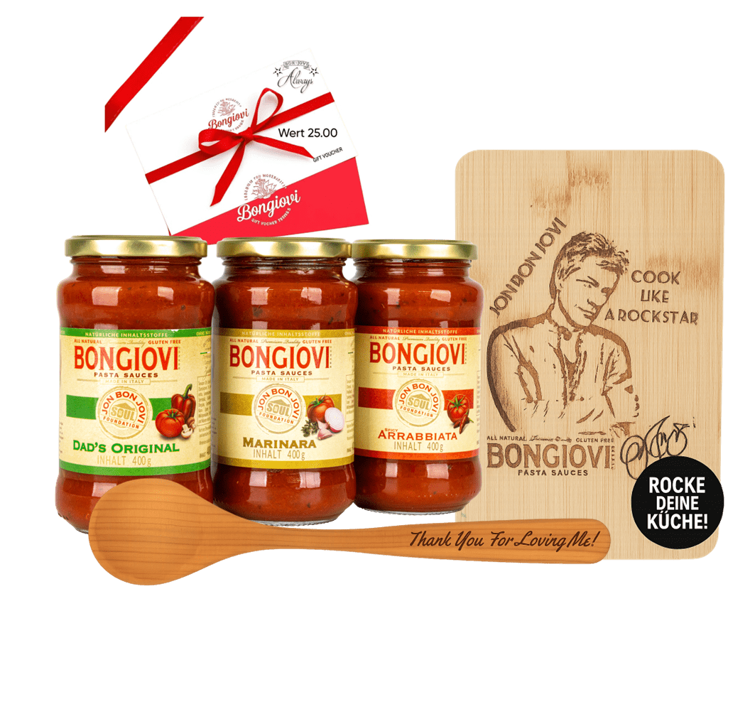Erleben Sie den Rockstar-Genuss mit unserem exklusiven Bongiovi Gift Bundle! Melden Sie sich jetzt an, um mehr über unsere Premium-Pasta-Saucen zu erfahren und verpassen Sie nicht die Chance, ein Teil der Bongiovi-Familie zu werden. 🎸