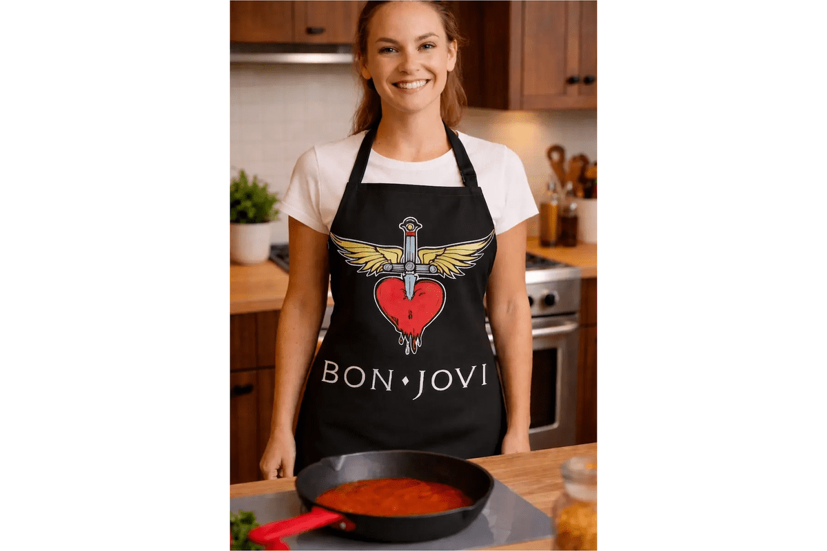 Stilvolle Kochschürze im Rock-Design mit ikonischem Herz-&-Dolch-Motiv. Ideal für Musikfans, Rockliebhaber und alle, die beim Kochen Stil zeigen wollen.